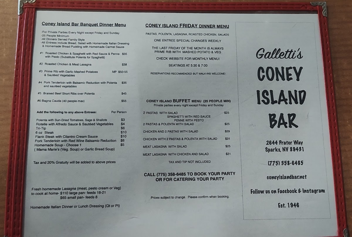 Coney Island Bar in Sparks, NV, offers a welcoming bar & grill experience cherished by locals and visitors alike. Their menu reflects a thoughtful blend of hearty comfort foods and fresh, wholesome choices. Highlights include expertly crafted turkey and roast beef sandwiches featuring juicy, homemade meats that promise satisfying flavors without heaviness. On select Friday nights, patrons enjoy a rotating menu with pasta dishes like pesto polenta paired with vibrant spinach salads, showcasing seasonal freshness. Families are catered for with simple yet delightful pasta options for children under 10, such as spaghetti with red sauce and penne with pesto. The dessert offerings stand out with indulgent homemade bread pudding and classic New York cheesecake drizzled in caramel sauce, perfect for a sweet finish. Complemented by a selection of sodas including the distinctive Henry Weinhard range, Coney Island Bar ensures every visit balances great food, warm service, and an inviting vintage atmosphere that keeps guests coming back.